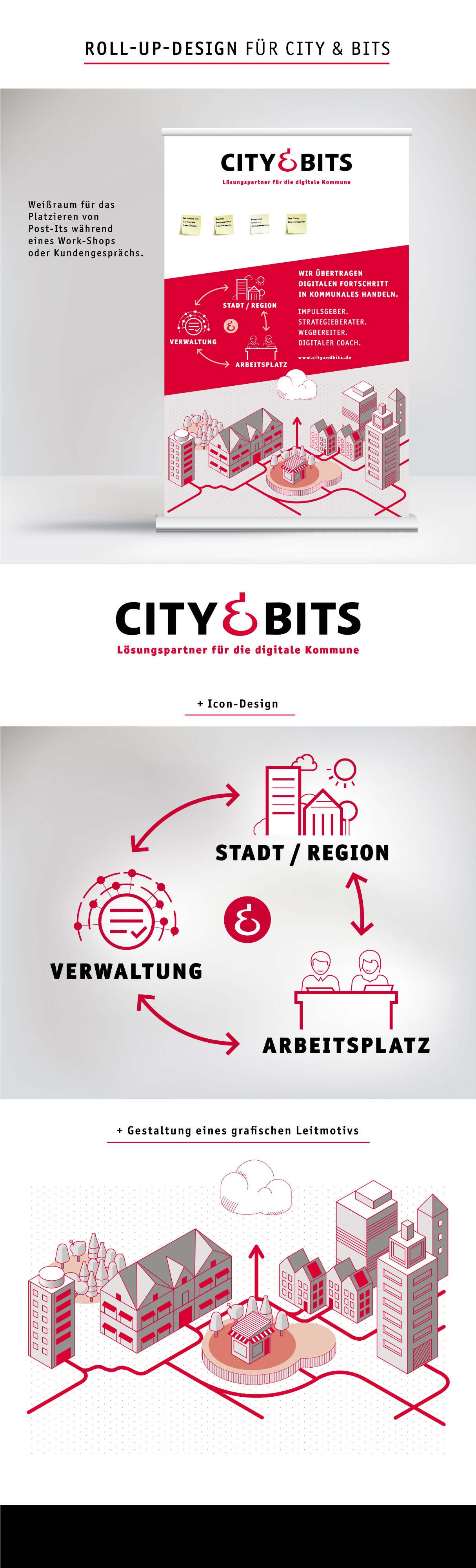 City and Bits beauftragte uns 2018 mit einem Roll-Up für Präsentationen. Die visuelle Idee, die Arbeit von City and Bits mit einer isometrischen Illustration zu verdeutlichen, wurde zum Leitmotiv. Als Folgauftrag sind wir momentan mit einer professionellen Powerpoint beschäftigt.